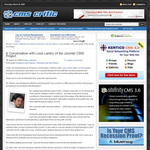 There is a great article in CMS Critic. In it, Mike Johnston interviews Louis Landry and brushes on history of the project, Louis's personal experiences, how the community and project have evolved, and where things are heading. It is an excellent article. Take time to read and please leave a comment for Mike and Louis on CMS Critic's site. Thanks Mike and Louis!