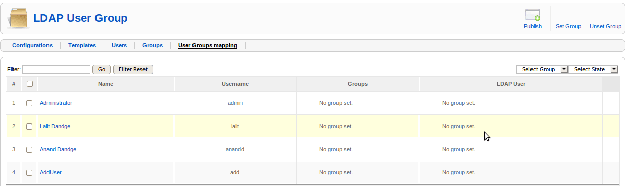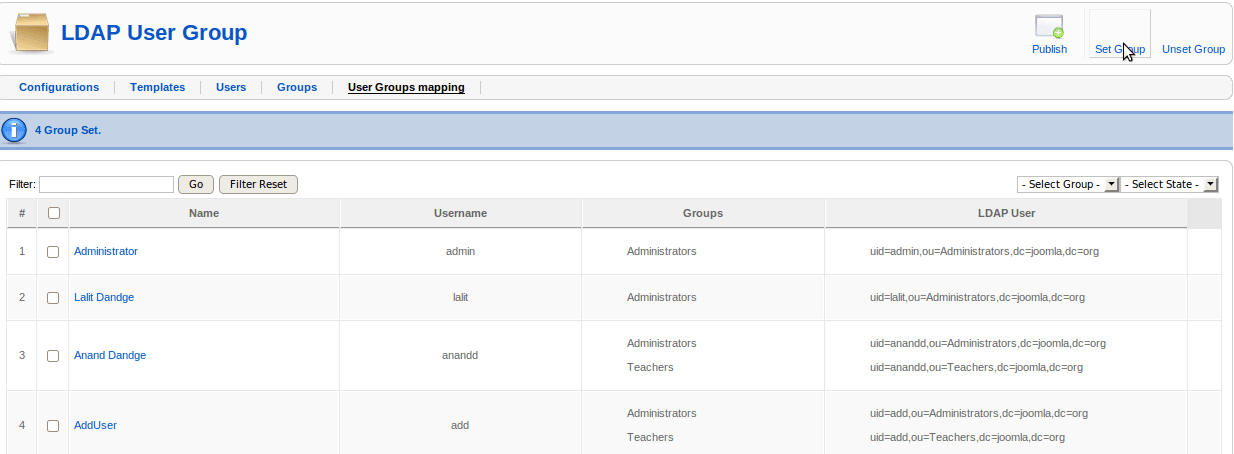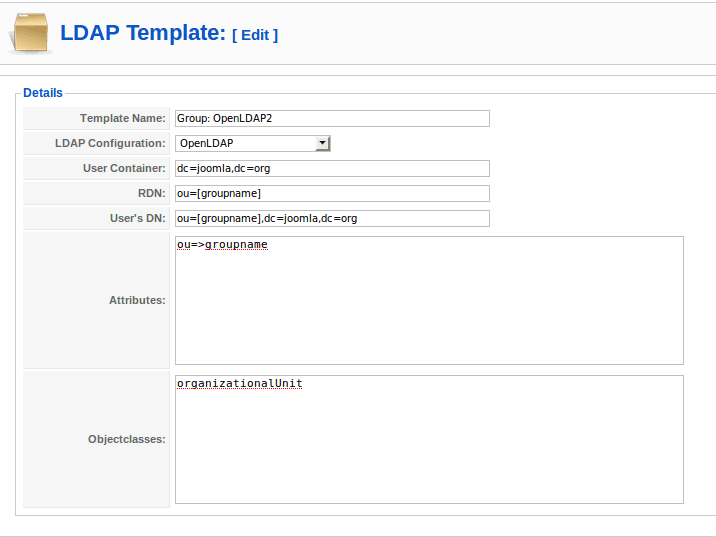 e.g. If the user template has the container as "ou=users,dc=joomla,dc=org" and the group added is "Administrator" (say "dc=joomla,dc=org is the container for group to be added"). Then after setting the group for particular user(say, "someuser") it is stored as "uid=someuser,ou=Administrator,dc=joomla,dc=org".
