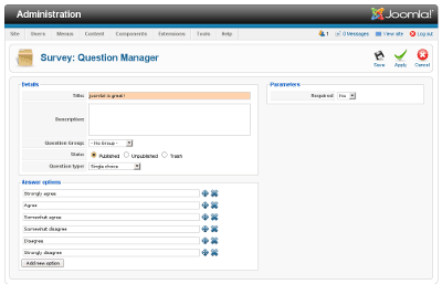 It took a bit more time than I expected to sort the extension out for a release candidate version, but it's here now. It isn't feature complete, due to the stability of Joomla! it was very hard to work with it. So I decided to create a good basic component that later I can extend. I think in this stage of Joomla! 1.6 it's better to have a basic, but stable component instead of a feature rich unstable version. The GSoC program ends soon, but the development of this extension is not, when Joomla! 1.6 becomes more stable, I'm going to add more features to the extension.